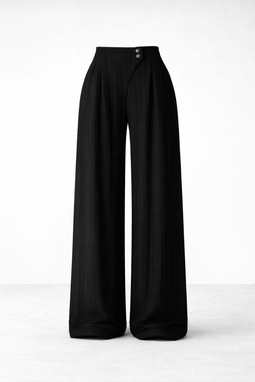 Upgrade your workwear essentials with these black high-waist pleated trousers. Designed in a wide-leg silhouette with subtle vertical pleats, these trousers offer a sleek drape, flattering fit, and all-day comfort. The minimal button-detail waistband adds a refined touch, making them ideal for office wear, formal meetings, and smart casual styling. A timeless black essential that pairs effortlessly with shirts, tops, and blazers.