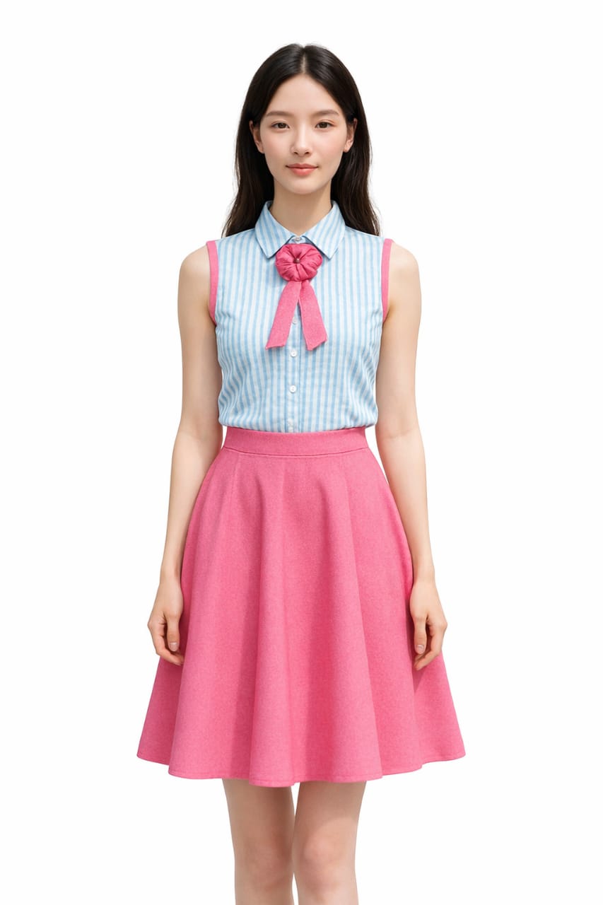 Add a touch of Korean-inspired elegance to your wardrobe with this blue and pink co-ord set for women. Designed with a sleeveless striped top featuring a classic collar and delicate bow detail, this outfit reflects soft Korean fashion aesthetics. Paired with a high-waisted flared pink skirt, the set offers a graceful, feminine silhouette.
