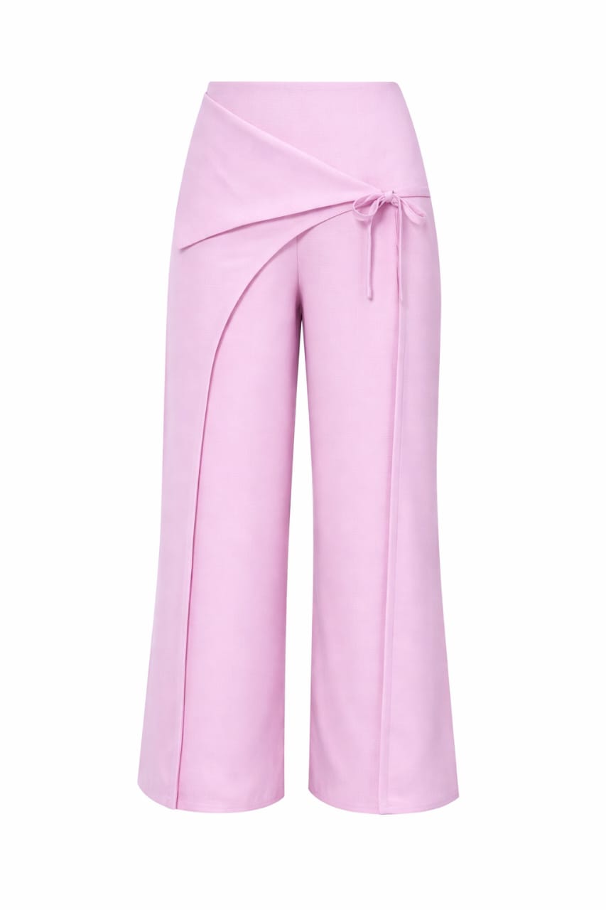Add a soft yet sophisticated charm to your wardrobe with these blush pink high-waist wrap-style trousers. Designed with an elegant overlap panel and adjustable side tie-up detail, these trousers create a flattering, structured silhouette while maintaining comfort. The wide-leg fit offers ease of movement and a graceful fall, making them ideal for office wear, formal meetings, and polished day looks.