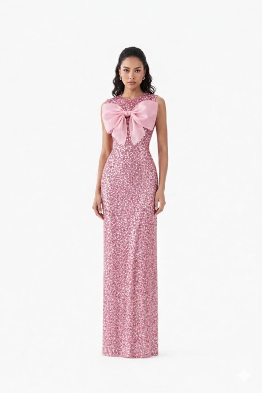 The sleeveless silhouette keeps the design modern and sleek, while the statement bow detail at the neckline adds a soft, feminine touch. The floor-length cut enhances the graceful flow of the dress, making it perfect for evening parties, cocktail events, receptions, and special occasions.